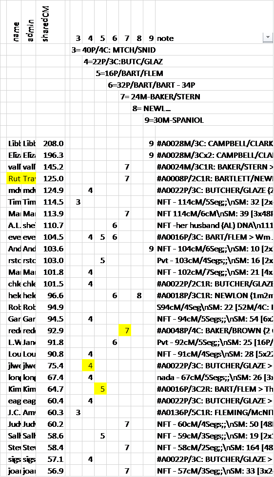 Next, pick another interesting 4C (your choice – I picked one I knew was a real 4C on a pair of 3xG grandparents I’ve done a lot of work on and with whom I have several established Triangulated Groups (TGs) from the other companies. I went to the next column and entered a 2 and yellow-highlighted that 2. I then ran Shared Matches on that Match, and put a 2 in the same column for each one of the SMs – again, some were closer cousins, higher in my spreadsheet, and some were lower, getting down to the end of the 4C SMs. Again, another column with all the same number. I made a blank row at the top of my spreadsheet with the numbers 1 to 20 in that row, and then froze that row, so I could see it as I scrolled down.