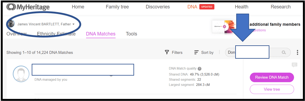 This is where two monitors really helps. Put MyHeritage (from the internet) on one screen and your segment spreadsheet on the other screen. From your spreadsheet, copy the Match name cell for “Don…” which has the full name, exactly how MyHeritage has it. Then paste this into the search box at MyHeritage.