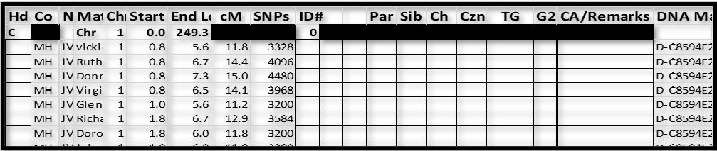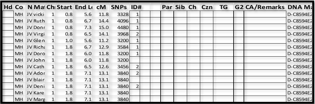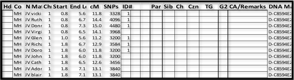 1. The Chromosome tips (Start and End of each Chromosome) usually have short TGs, and they are sometimes hard to figure out. For a few of these Chromosomes, I actually shifted to the middle of the Chromosome in the spreadsheet, and worked both ways. It doesn’t matter much as every shared segment has to be in one overlapping group or the other (or be false).