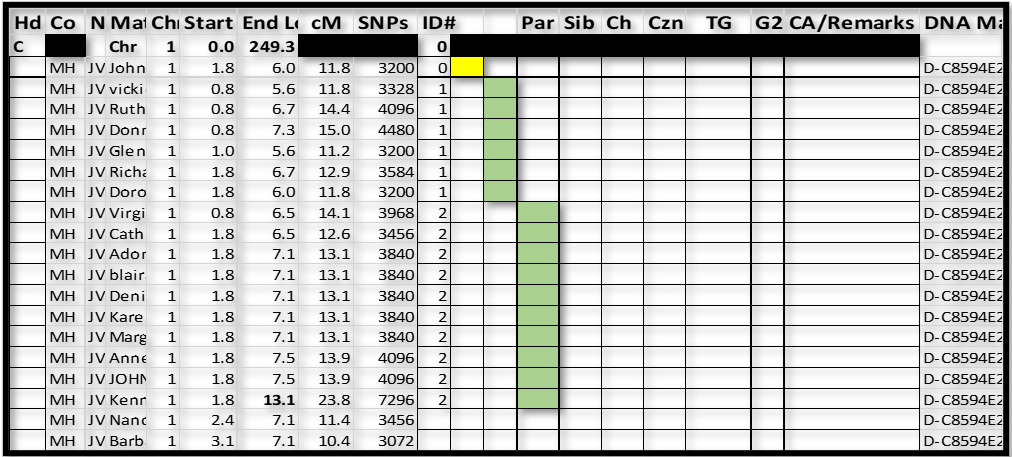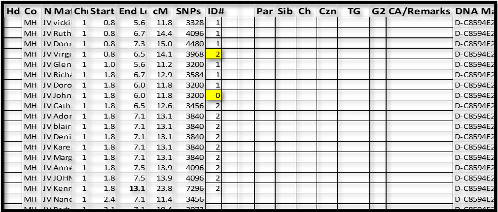 6. Even with a lower threshold of 10cM, some of the 10-15cM segments don’t always match others as they should. I note that MyHeritage uses imputation to add “most probable” SNPs, in order get larger, more complete segments. But I recall that they don’t use these inputed SNPs when they declare TGs – so even though there is an overlap, sometimes MyHeritage won’t indicate a TG. As a result, not all overlapping segments in a group with show with a MyHeritage TG. I got used to it. After all, every shared segment has to be from one parent or the other (or be false). So if a segment shows as TG with several others, it’s probably true, even if it doesn’t match every segment it “should” match. If you get frustrated with a Match-segment in your spreadsheet, just code it ID# 0. You can ignore it now, or forever. It saves time to “skip over” problem segments.