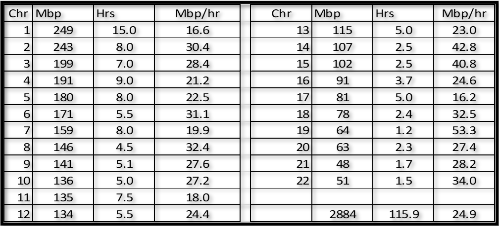 This part is hard work. It’s not difficult – the grouping process is fairly straightforward. But I cannot sugar coat it – it is tedious. I used a stop watch to time each chromosome, and I got better (more Mbps grouped per hour) as I progressed through the Chromosomes. In total it took me 120 hours – a table of hours is at the end of this section.