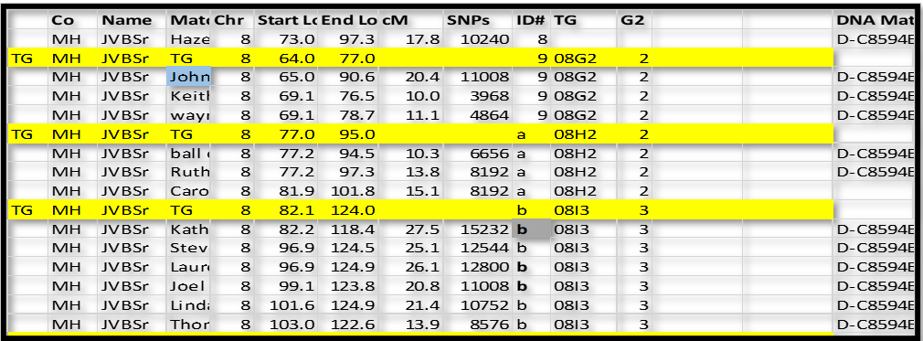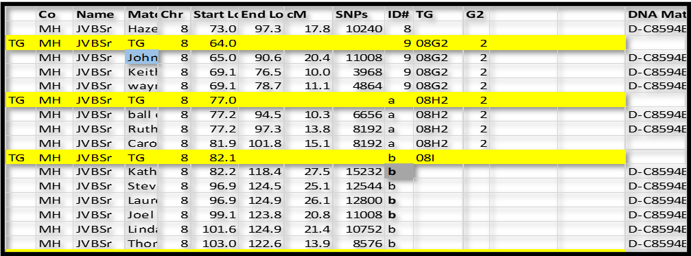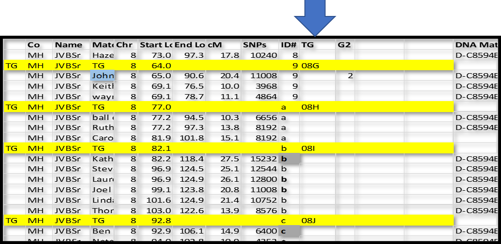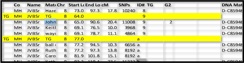 In this case, I inserted a new row just above ID#9 in Chromsome 8. I like to use a highlight color. For these “group” rows, add TG in column A; and TG in the Match name column; type the Chromosome number in that column; and the ID# in that column. In the Start Location column type in a number just a little bit smaller than the first segment – I typed in 64.0 over 65.0 for ID#9 and 77.0 over 77.2 in ID#a. The idea is that I can sort the spreadsheet by Chr, ID# and Start and always come back to this list with all the Match-segments sorted in their respective groups.