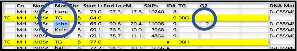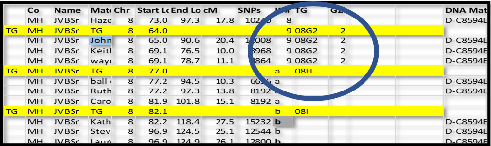 All of the shared segments in group ID# 9 are now assigned to TG 08G2 and G2 = 2 (paternal side). This 2 on the paternal side is important because, later, I can separate all my segments into paternal and maternal sides, and very easily see how they are adjacent (or not) to each other. They should be adjacent to each other, and this kind of a sort will highlight any gaps.