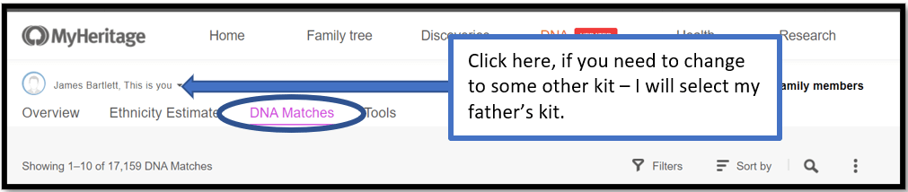 Select the kit you want to use – for this example I will use my father’s kit, which I had not Triangulated at MyHeritage before.