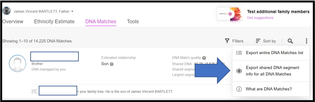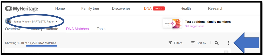 Here is my father’s page – note 14,225 DNA Matches. Click on the 3-dot ellipsis on the right.