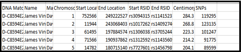 2. The headers are: DNA Match ID [you’d only need this in case of 2 Matches with the same name]; Name [base person with all the Matches – usually you, but in this case my father, James Vincent Bartlett]; Match name [name of each Match – I reduced the width of this column to hide the names for privacy]; Chromosome; Start Location; End Location; Start RSID; End RSID [these RSIDs identify a SNP – useless info to me]; CentiMorgans; and SNPs.