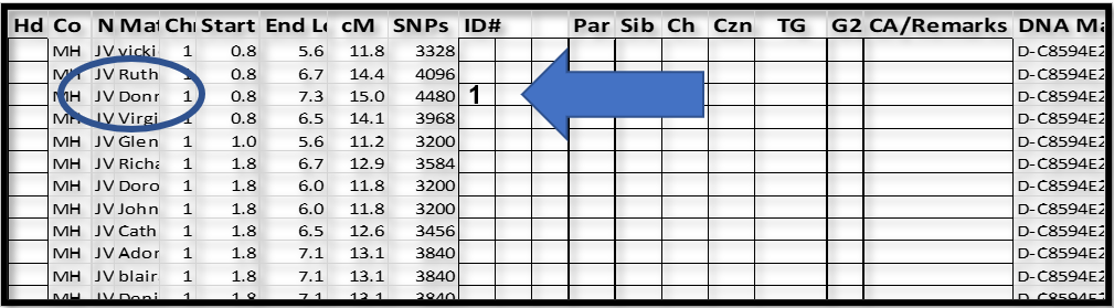 1. This is the top of the list of 168 Shared DNA Matches between my father and Don. The top two Matches are a close relation to Don and a close relation (me) to my father. Please note the “triangulated segment(s)” icon to the right of these two Matches. In this case Don shares two segments with my father, so I need to click on the icon to insure each Shared DNA Match is sharing the DNA segment at the beginning of Chromosome 1 in the spreadsheet. Scroll down the Shared DNA Matches at MyHeritage, noting which ones share a triangulated segment on Chr 1, and note them with a digit in the ID# column: