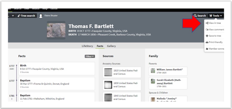 5. This brings up a profile page for this Ancestor. You probably already knew the basics for this Ancestor, but this may present a lot more. But this Ancestor is NOT the one you are looking for – you started with this Ancestor because you wanted to extend the Ancestry for your Match. So, focus on the parents of this Match. Actually, just click on Tools > View in Tree (see red arrow below):