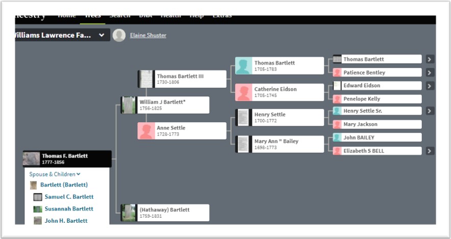 6. This brings up the pedigree view of the Ancestor’s ancestors (see below). If your Common Ancestor is listed here – you’re done – you’ve found the CA of your DNA Match. If not, the CA may be on the maternal side below which is not in this Tree – delete this page and try another public tree.