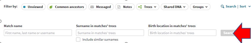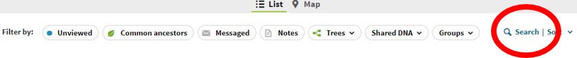 Here is another way to use the same search-on-a-surname/location process. A Match and I found a Common Ancestor, but on looking at his Tree, I thought one of the links in his ancestry was incorrect. So I proposed that he search his Matches for the link’s spouse’s surname/location in one case and search for my version of his link’s spouse’s surname/location in the other case. He reported “many, many Matches” in one case and none in the other. Case closed.
