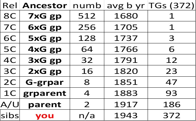 Column 3 shows how many of each type of Ancestor. Example: we all have 32 3xGreat grandparents.