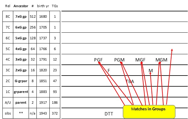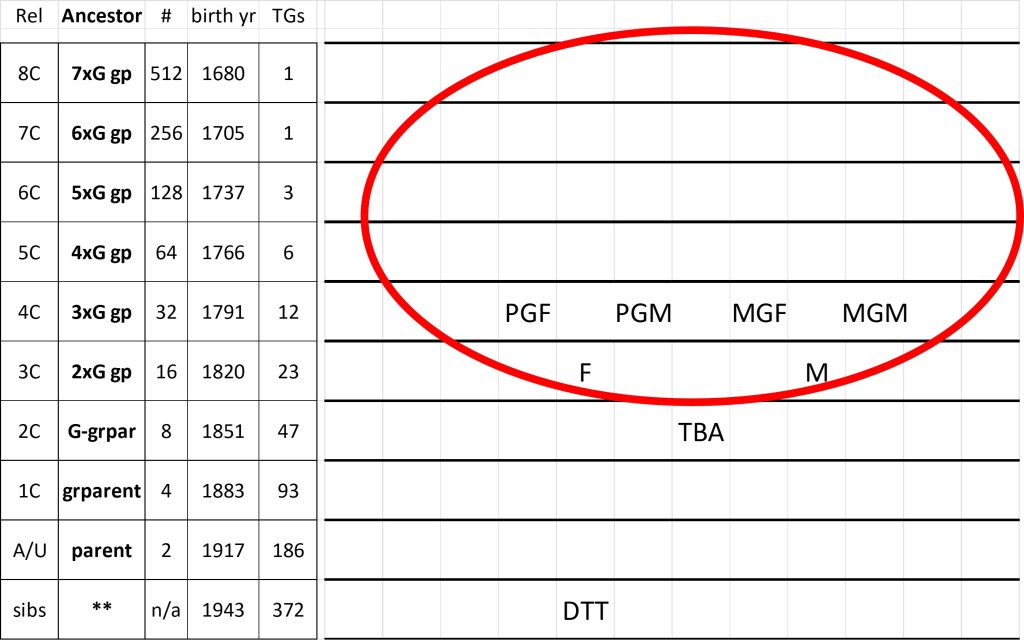 The key points here include the F (father) and M (mother) of the TBA; and the TBA’s four grandparents; and the oval that highlights a lot of additional Ancestors of the TBA. All of these Ancestors, as yet unknown to the DTT, are Ancestors of the TBA – AND all are Ancestors of the DTT! These Ancestors are NOT known to the DTT, but they ARE known to many of DTT’s Matches.