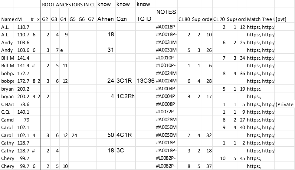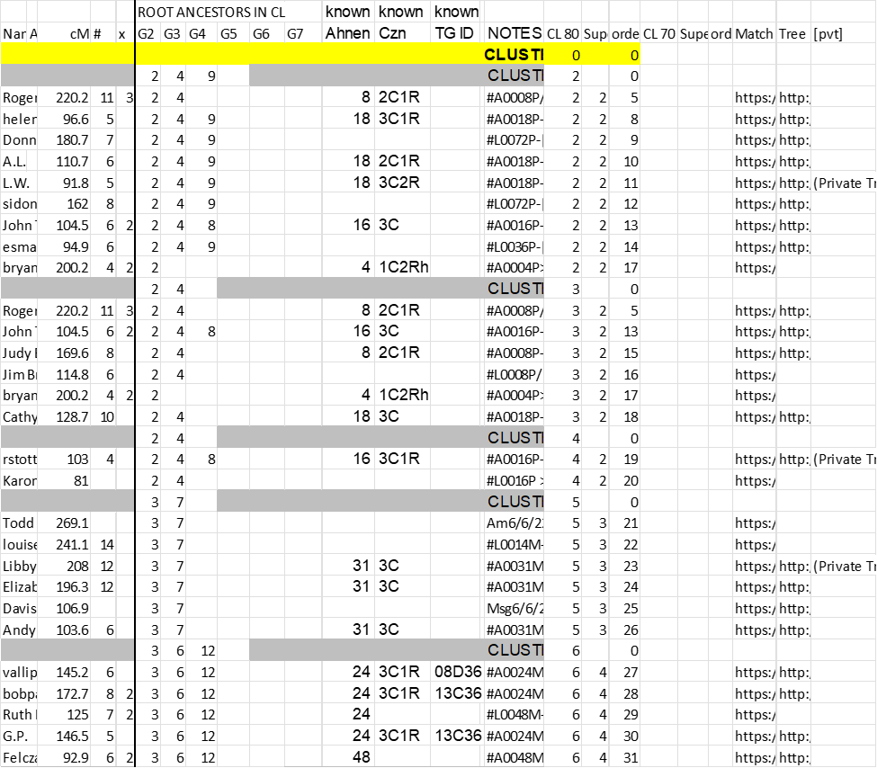 e. A very few Matches in a Cluster may be at odds with the consensus. This may be due to an incorrect MRCA (it happens to me and to ThruLines). It may also be due to the Matches having multiple MRCAs with me, and/or multiple segments. Check the DGC HTML file to see if there are grey cells that link the Match to another Cluster(s). When a Match appears to me to be “better” in a linked Cluster, I move their row to that other Cluster in the spreadsheet and change the CL number to match (I leave the order number in case I want relook at the original Cluster list.)