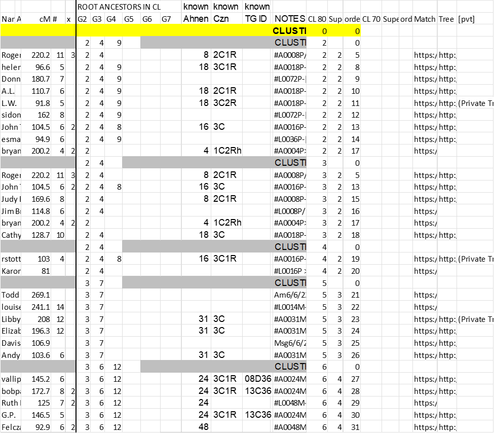 6. Special Note: Some close Matches have multiple MRCAs with me. They may well be related though multiple Clusters. I make duplicate copy of that Match and add it to other Clusters per the gray cells. Once moved I adjust the CL and super columns per their new Clusters. Use judgment, but I think after about two cycles with the multiple copies of close Matches (closer than the Cluster Root Ancestors indicate), they can be eliminated from future Clusters. They have done their job of solidifying the root ancestors in other Matches.