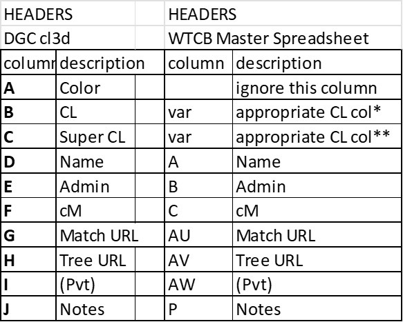 Here is a list of the 10 columns from the DGC Cluster run spreadsheet and where 9 of them go in the Master spreadsheet: