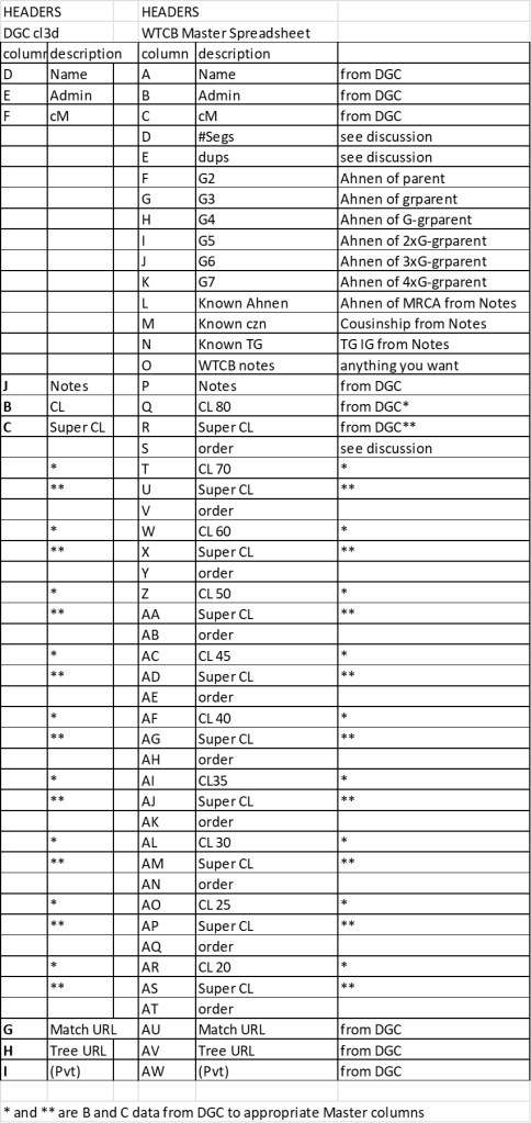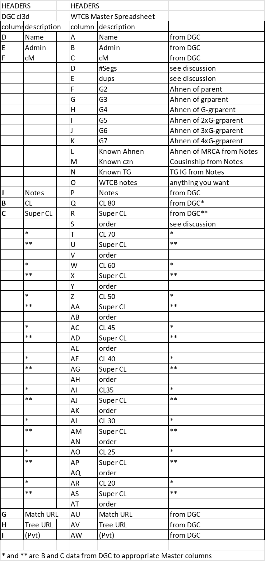 As part of this overview, I must provide a warning: there is a lot of homework required before you can start this process – see the Homework section below. The Cluster runs include the Notes for each Match. These Notes should include “known” Match MRCAs and cousinships [including multiple MRCAs], and any TG IDs, that you have determined. This is the information you need to populate your Master WTCB Spreadsheet. This is your source for RAs.