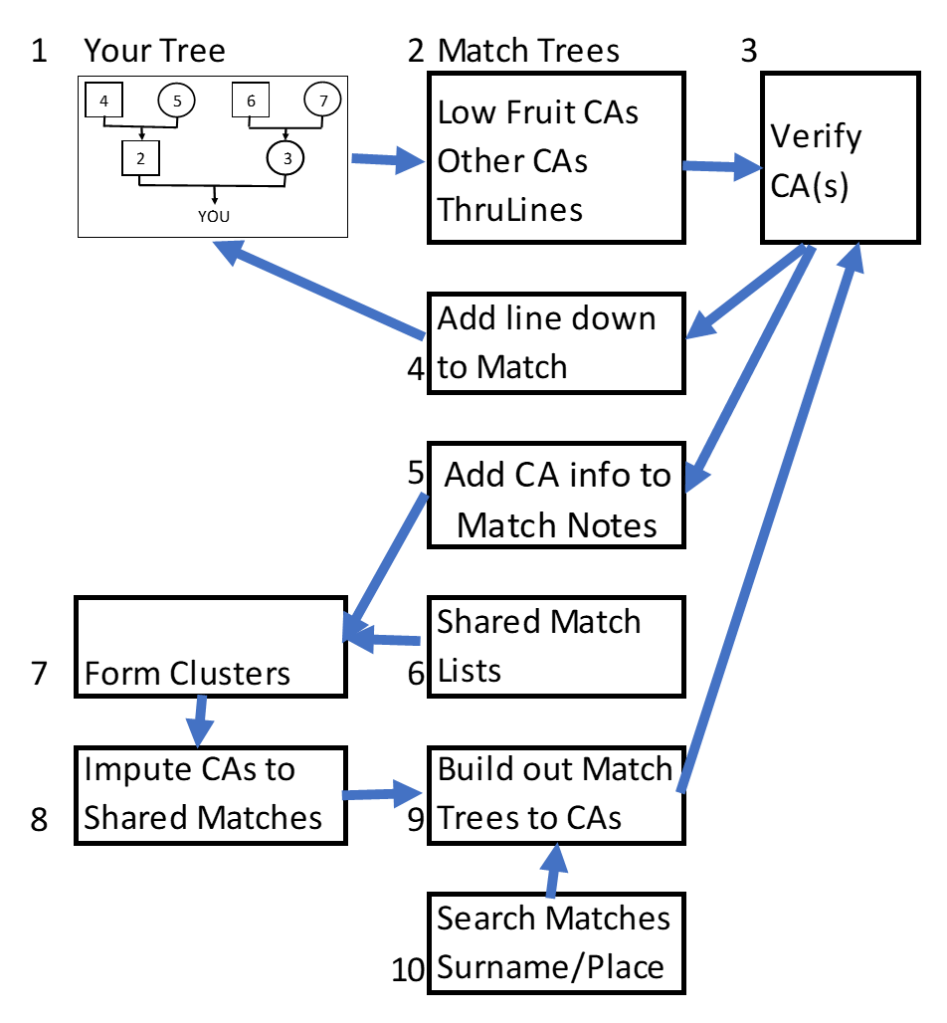 9. For Matches with *clues* in their Notes, see if you can build out their Tree to the CA. Building out Trees is one of best genealogy Tools, and it’s somewhat more efficient when you have a target CA (with known surname and timeframe and location). At this point, cycle back to Step 3 and verify the line and Step 4 add it to your Tree and Step 5 add the information in the Match’s Notes.