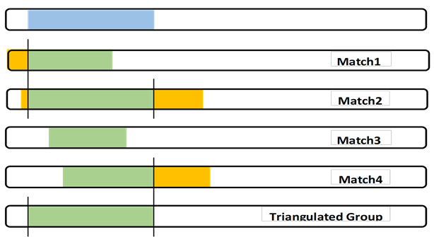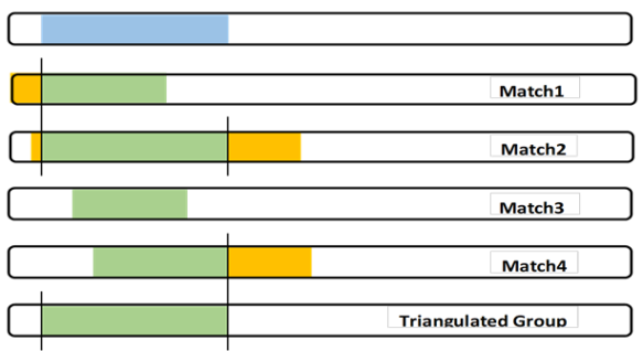 Judgment: Sometimes there is a close relative, Match 5, who overlaps much more than me and Matches 2 and 4. Experience (and judgment) tells me that this somewhat larger segment is probably from a close relative whose Common Ancestor with me includes a father/mother more distant – with one of them being the CA for the full TG.